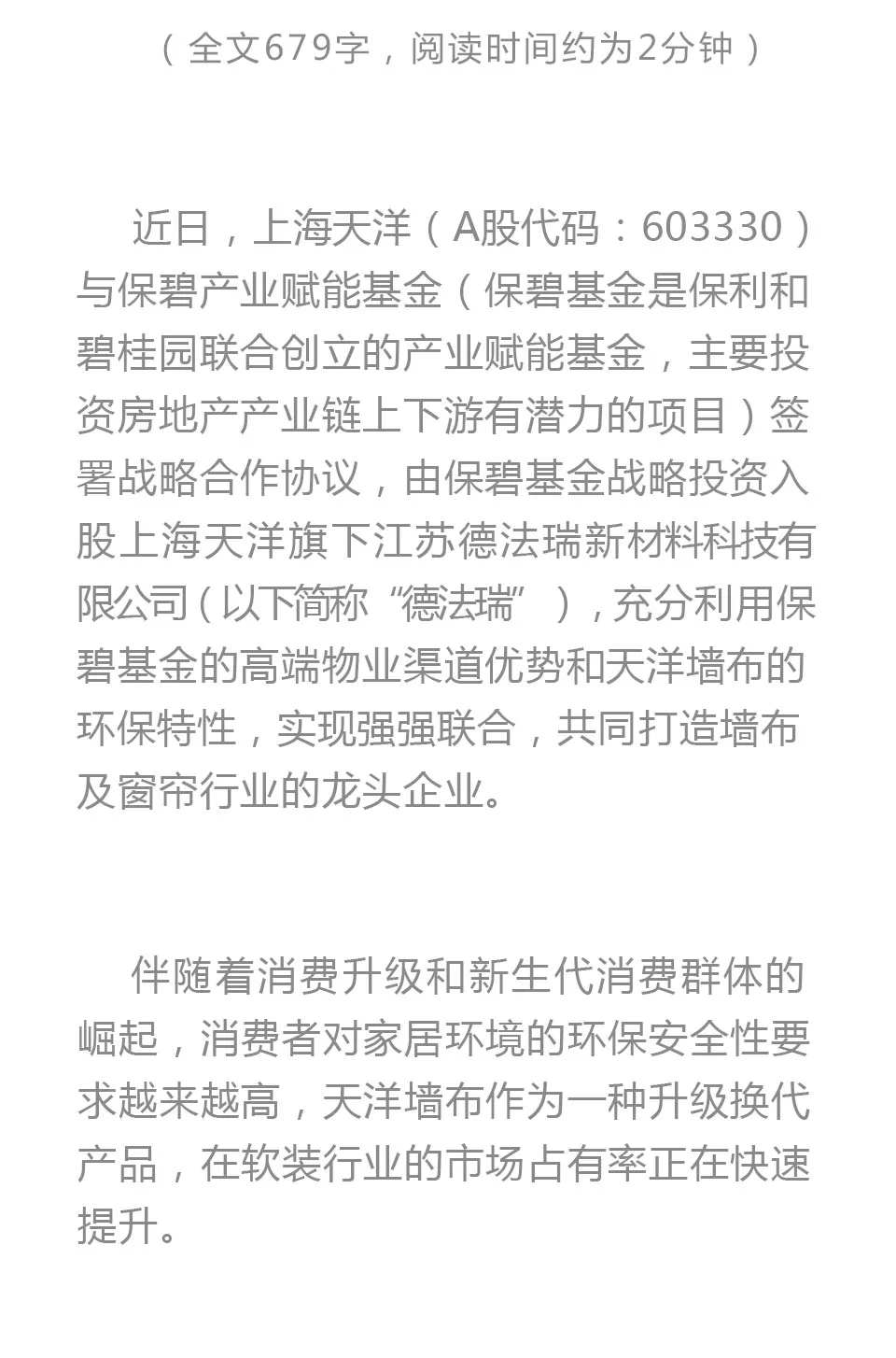 上海天洋攜手保碧產(chǎn)業(yè)賦能基金打造墻布、窗簾行業(yè)新龍頭